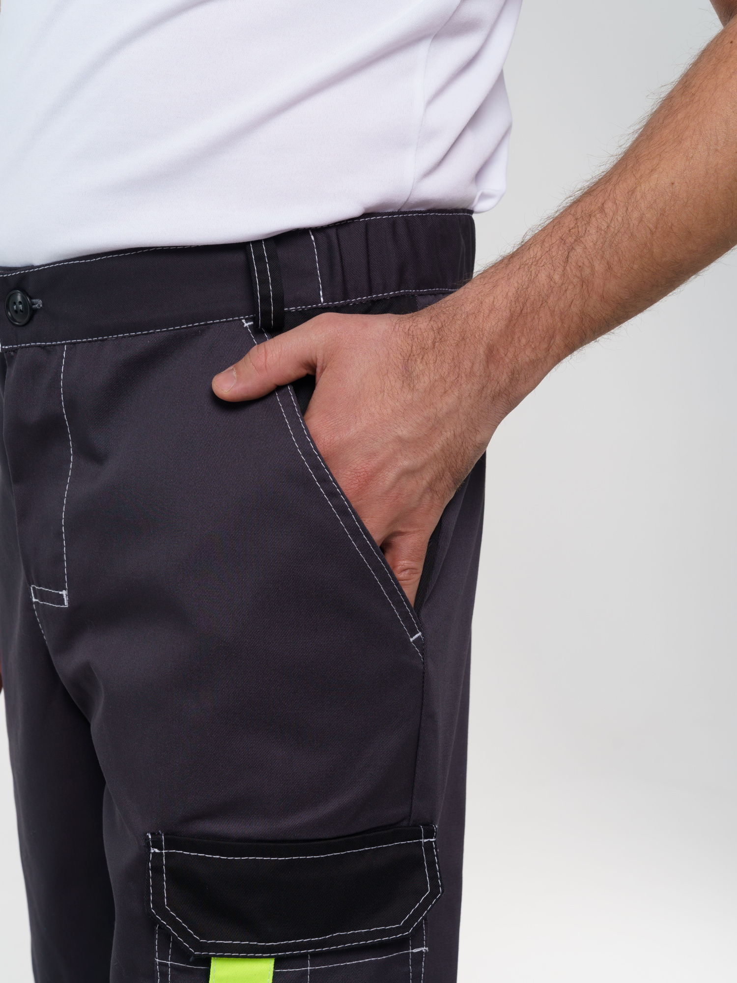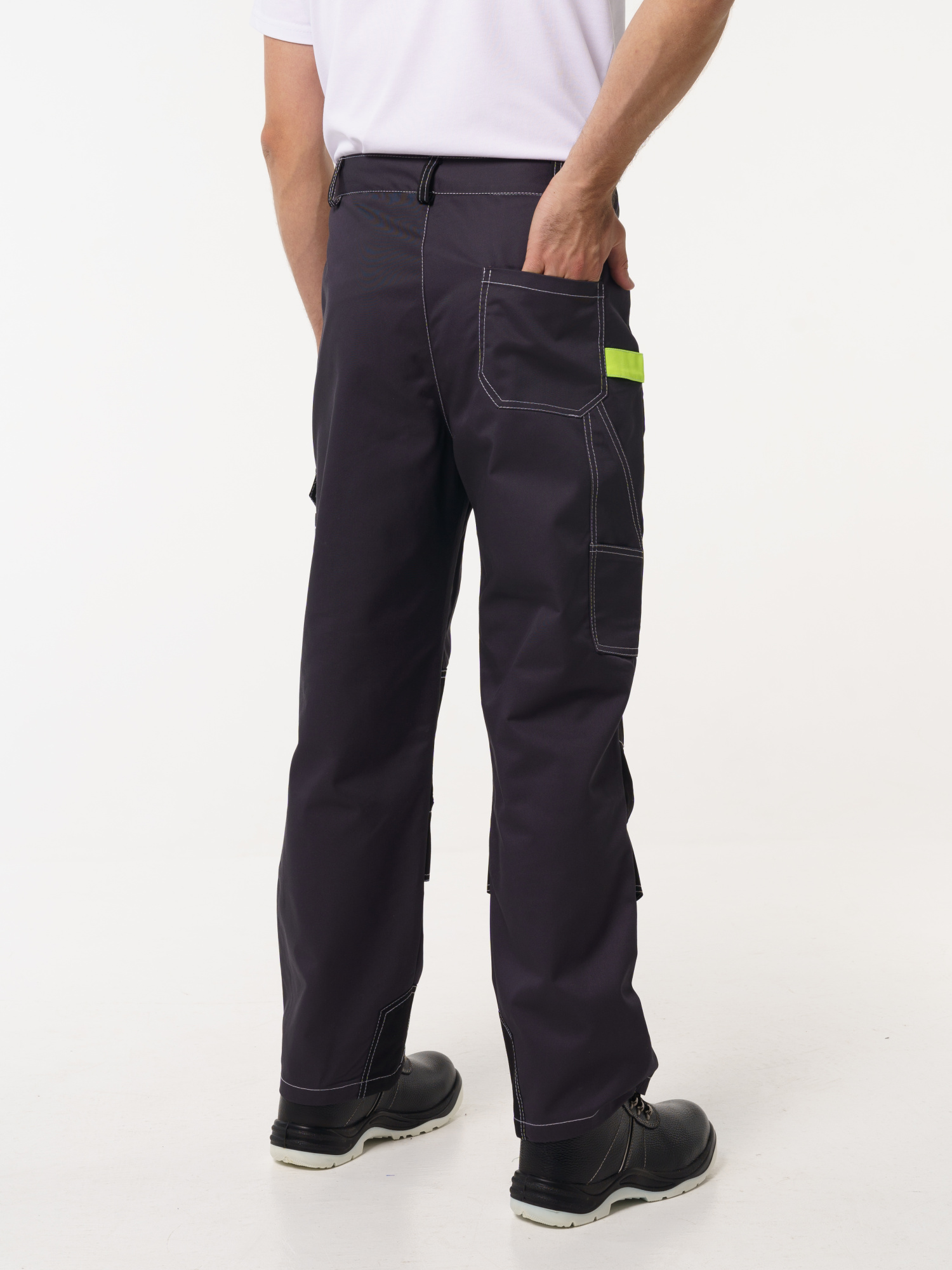 Брюки ФАВОРИТ-МЕГА прямые; с застёжкой гульфика на тесьму - «молния»; с застежкой пояса на одну петлю и пуговицу; с боковыми внутренними карманами; с карманами и фигурными клапанами застегивающиеся на потайную липучку на боковом шве; с фигурным карманом на задней половинке; с карманами под инструменты; с наколенниками. Пояс брюк частично стянут резинкой ткацкой по бокам. В брюках предусмотрена лента светоотражающая (мелкодисперсная белая) 50 мм фигурной формы. имеются лимонные отделочные элементы на карманах.