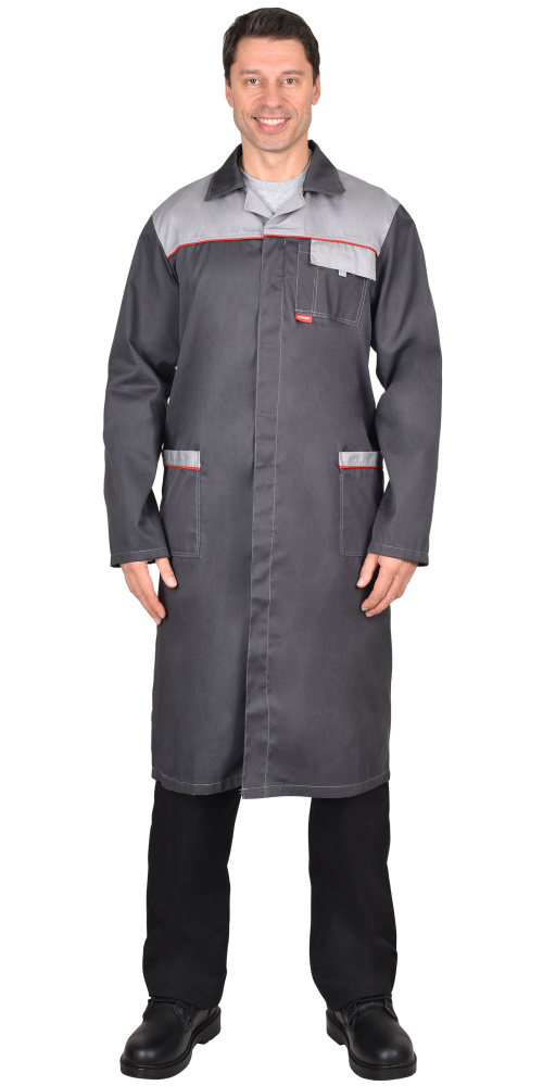 Кант: красный. Потайная застёжка на пуговицы, нагр, бок. карманы. Спинка с хлястиком и шлицей. ГОСТ 12.4.132-83.