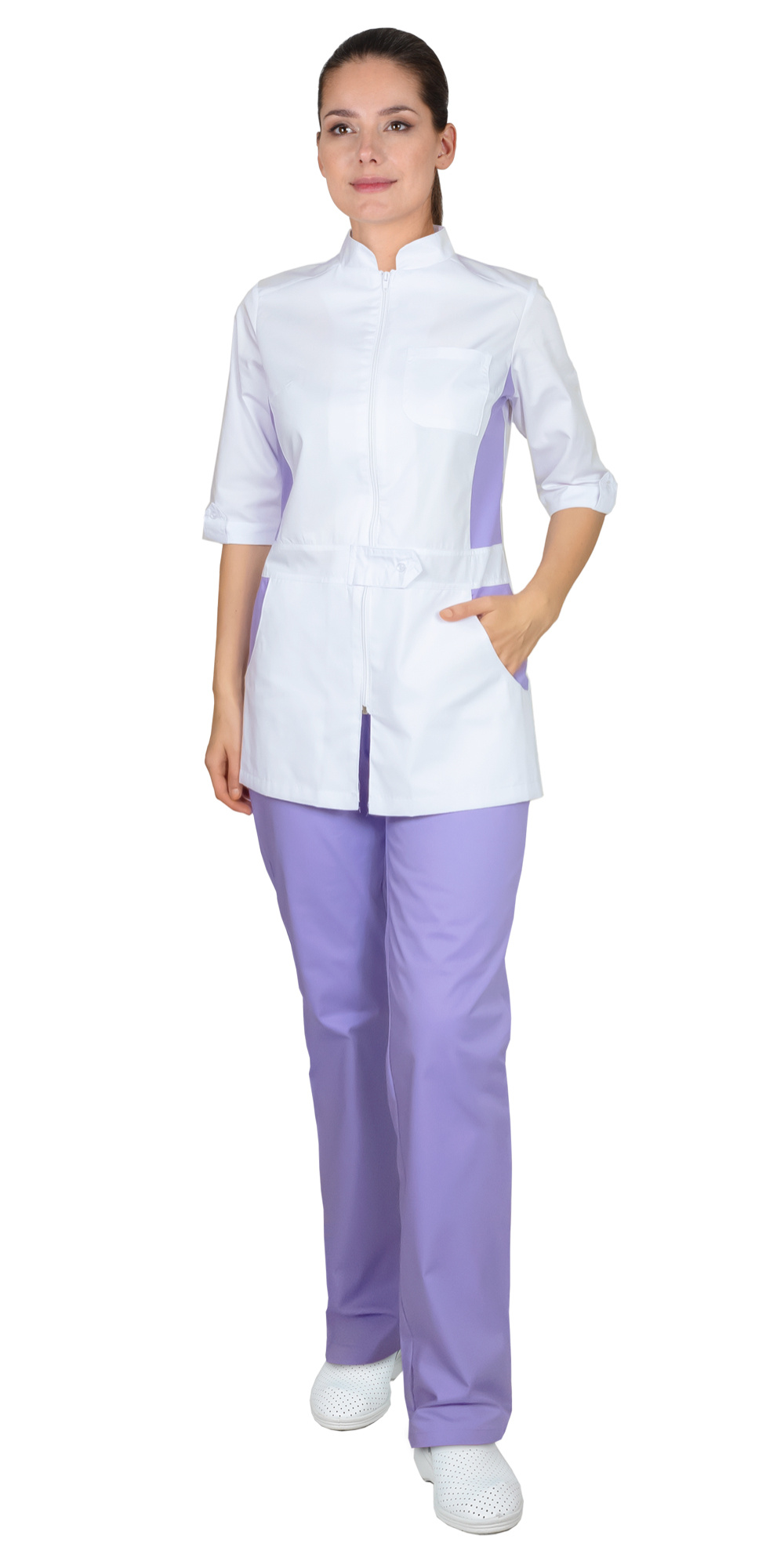 Костюм комбинированный из ткани двух цветов состоит из блузы белого цвета с отделкой и брюк фиолетового цвета.
