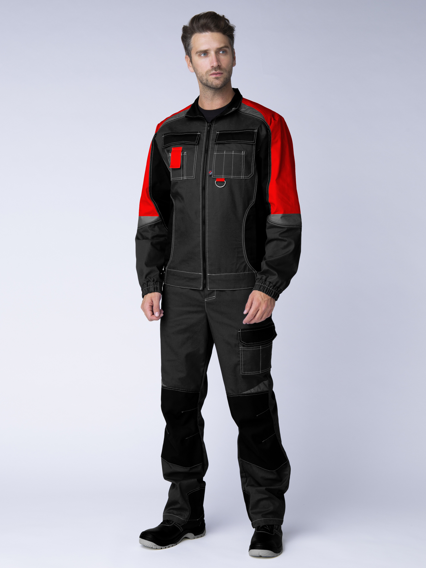 Костюм мужской рабочий «Формула» изготовлен в соответствии с ГОСТ и включает в себя два предмета: рабочая куртка мужская + брюки рабочие. Укороченная куртка удобно застегивается на молнию, оснащена поясом с регулировкой по ширине. Для безопасной работы в местах с плохим освещением предусмотрены светоотражающие полосы. Благодаря яркой контрастной отделке рабочая форма заметна издалека даже днем. Боковые и нагрудные карманы с клапаном на липучке предназначены для записей и мелочей. Рабочие брюки усилены дополнительной тканью в районе коленей и шагового шва снизу. В многозональных карманах разного типа и размера удобно хранить инструменты и расходники. Комфортную работу в неудобных позах обеспечивает анатомический крой коленей и локтей, а также возможность размещения ЭВА-вкладышей в карманы-наколенники.
