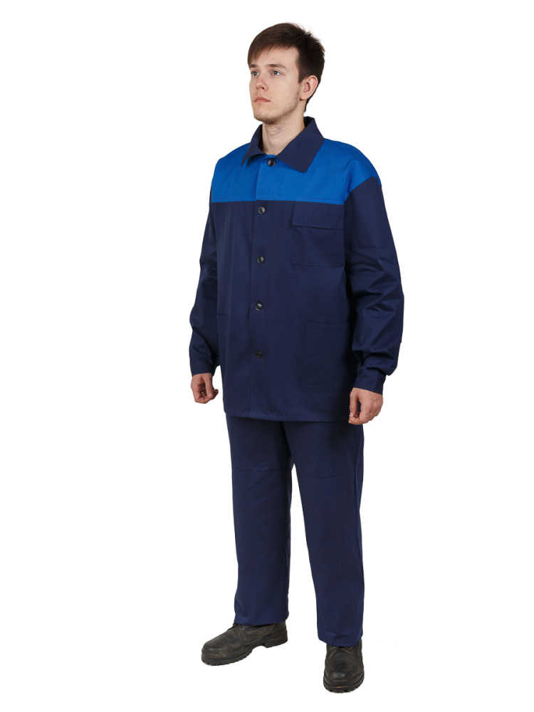 Костюм состоит из куртки и брюк: куртка с центральной бортовой застёжкой на пуговицы, нагрудным и боковыми карманами, отложным воротником. Кокетка из ткани контрастного цвета. Брюки с поясом и накладными карманами. Рукава усилены налокотниками, брюки – наколенниками.