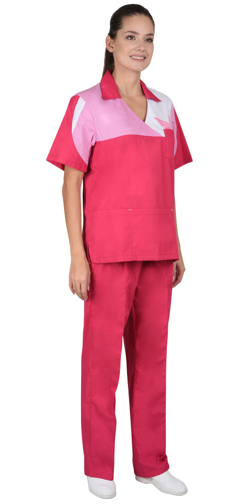 Костюм состоит из блузы и брюк. Блуза прямая с V-образным вырезом горловины и отложным воротником. С нижним накладным большим карманом, разделенным на три. Рукава короткие. Брюки прямые с притачным поясом стянутым резинкой и с отстроченными стрелками.