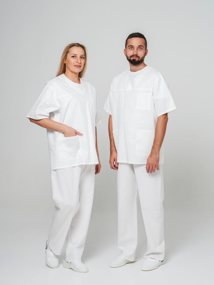 Костюм состоит из блузы и брюк. Блуза с V-образным вырезом горловины, с левым нагрудным карманом и двумя боковыми накладными карманами. Брюки с резинкой в поясе.