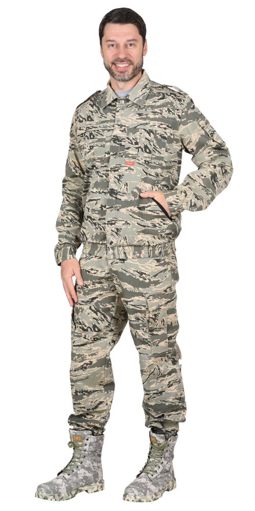 Костюм состоит из куртки и брюк. Куртка прямая с центральной застежкой на молнию, закрытой клапаном на кнопках; по низу пояс, собранный на резинку по бокам и спинке; кокетки на полочке и спинке, отложной воротник, на плечах погоны. Верхние карманы застегиваются на молнию, удобные нижние карманы; манжеты по низу рукавов регулируются с помощью кнопок. Брюки прямые, с центральной застёжкой на тесьму – «молния», с притачным поясом стянутым эластичной тесьмой по бокам, застегивающимся на две кнопки, с пятью широкими шлевками, с различными многофункциональными карманами, с наколенниками. Ткань верха: «Рип-стоп» смесовая с ВО пропиткой состав: 65 % п/э, 35% х/б, пл. 215 г/м2. ГОСТ 12.4.280-2014