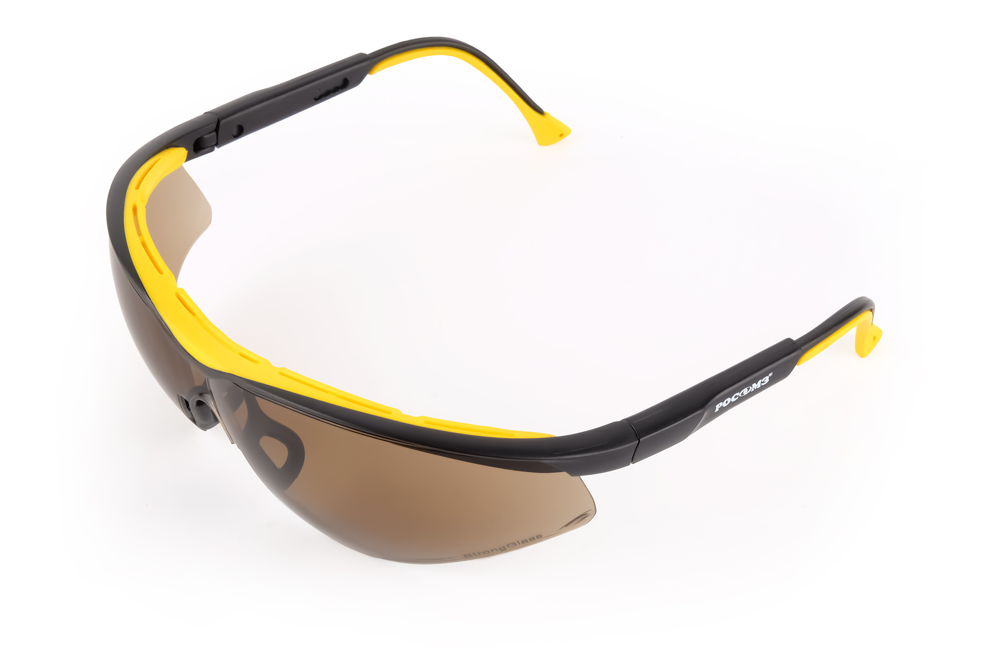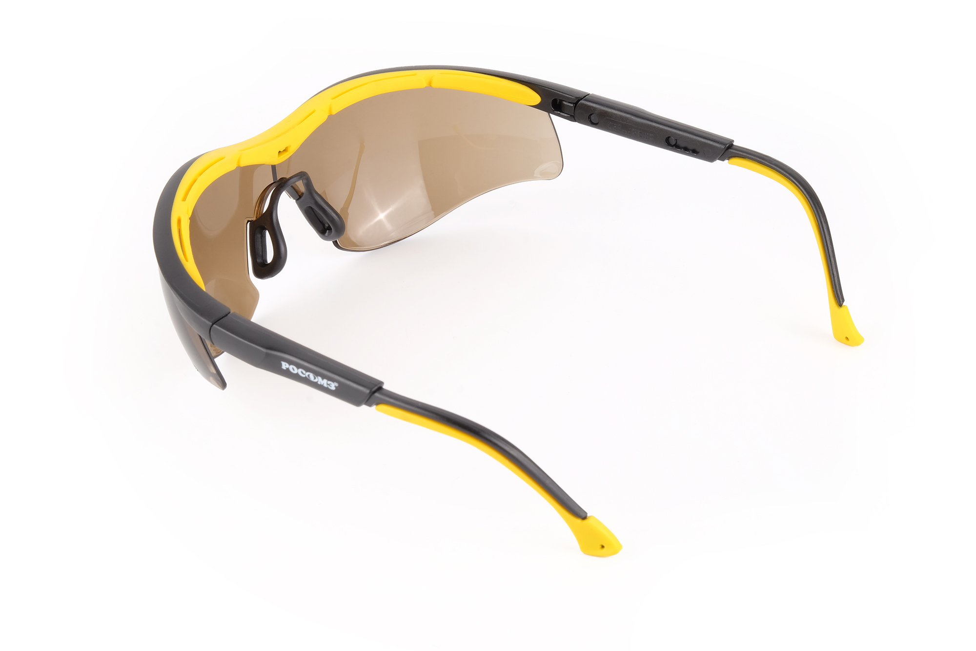 Очки открытые с мягкой вставкой в области лба, двухкомпонентными регулируемыми по длине и углу наклона заушниками с мягкими вставками и мягким носоупором из термо-холодостойкой резины.