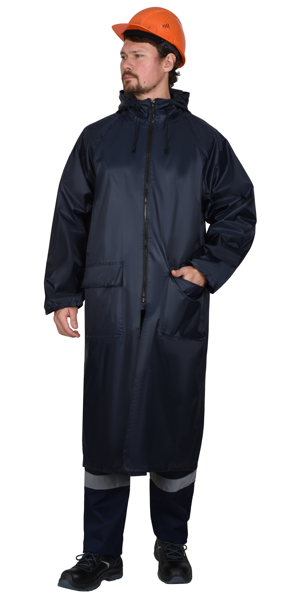 Плащ имеет два накладных кармана с клапанами. Центральная застежка на молнию со скрытой внутренней ветровой планкой. Все швы прошиты и склеены. Каждый плащ упакован в отдельный прозрачный пакет.