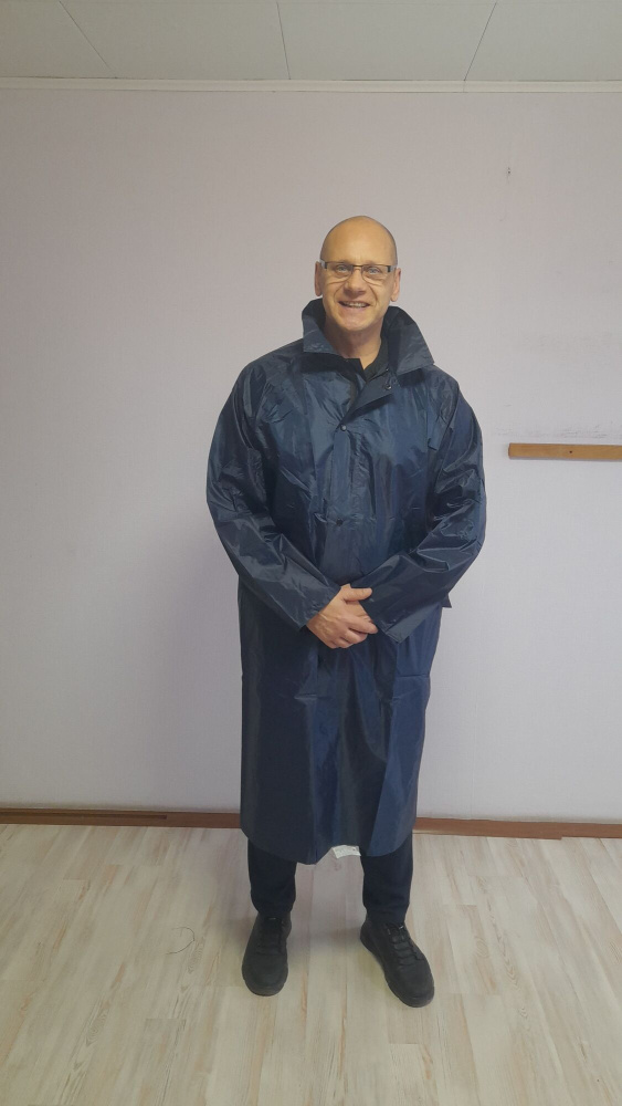 Изготовлен из пэ ткани с ПВХ покрытием плотностью 200г.  Застегивается на молнию  с ветрозащитным клапаном на кнопках, 2мя накладными карманами с  клапанами, капюшоном убирающимся в карман воротника. Швы проклеены специальной лентой