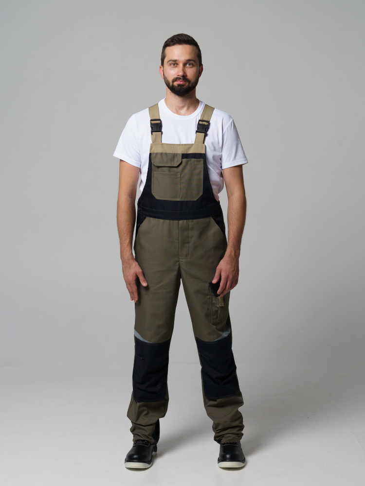 Полукомбинезон с застёжкой гульфика на молнию и застёжкой в боковом шве на пуговицы; с различными многофункциональными карманами; с объемными наколенниками. В полукомбинезоне предусмотрена лента светоотражающая (мелкодисперсная белая) 50 мм фигурной формы.