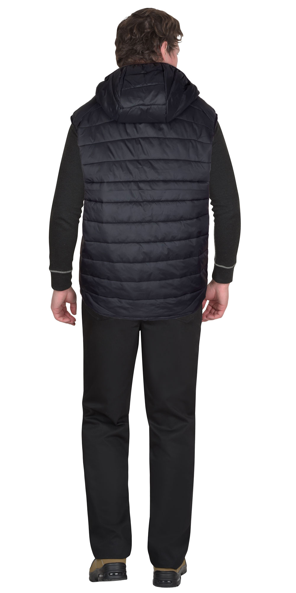 Жилет утепленный из стёганного полотна, с центральной бортовой застёжкой на молнию, с втачным капюшоном, с общей кокеткой полочек и спинки, с карманами на молнии в шве рельефа, с удлинённой фигурной линией низа на спинке. Низ куртки, пройма и лицевой вырез капюшона окантованы эластичной тесьмой.