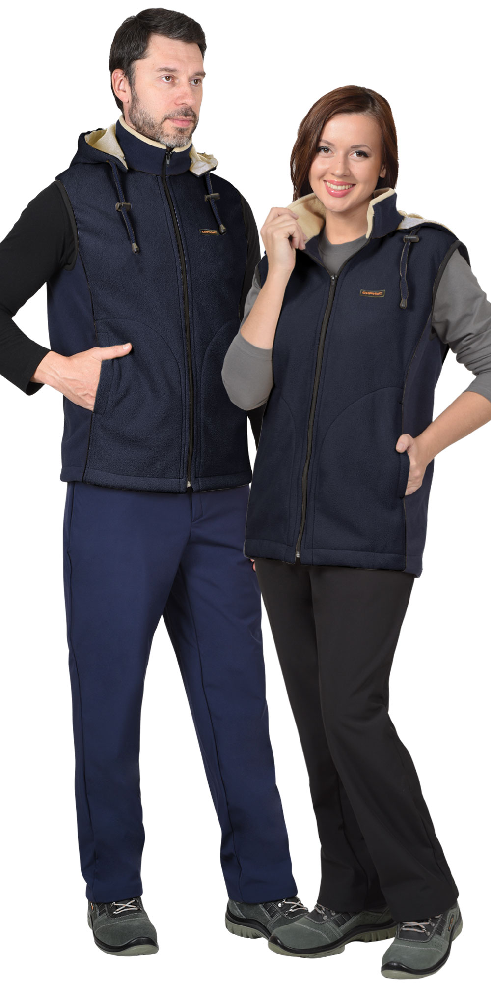 Жилет из дублированного флиса, без подкладки, прямого силуэта, с втачным воротником стойка, со съёмным капюшоном, со сквозной центральной, бортовой застёжкой на молнию, с отрезными бочками, с нижними боковыми карманами в рельефе. Пройма окантована резинкой ш.25 мм. ТР ТС 017/2011