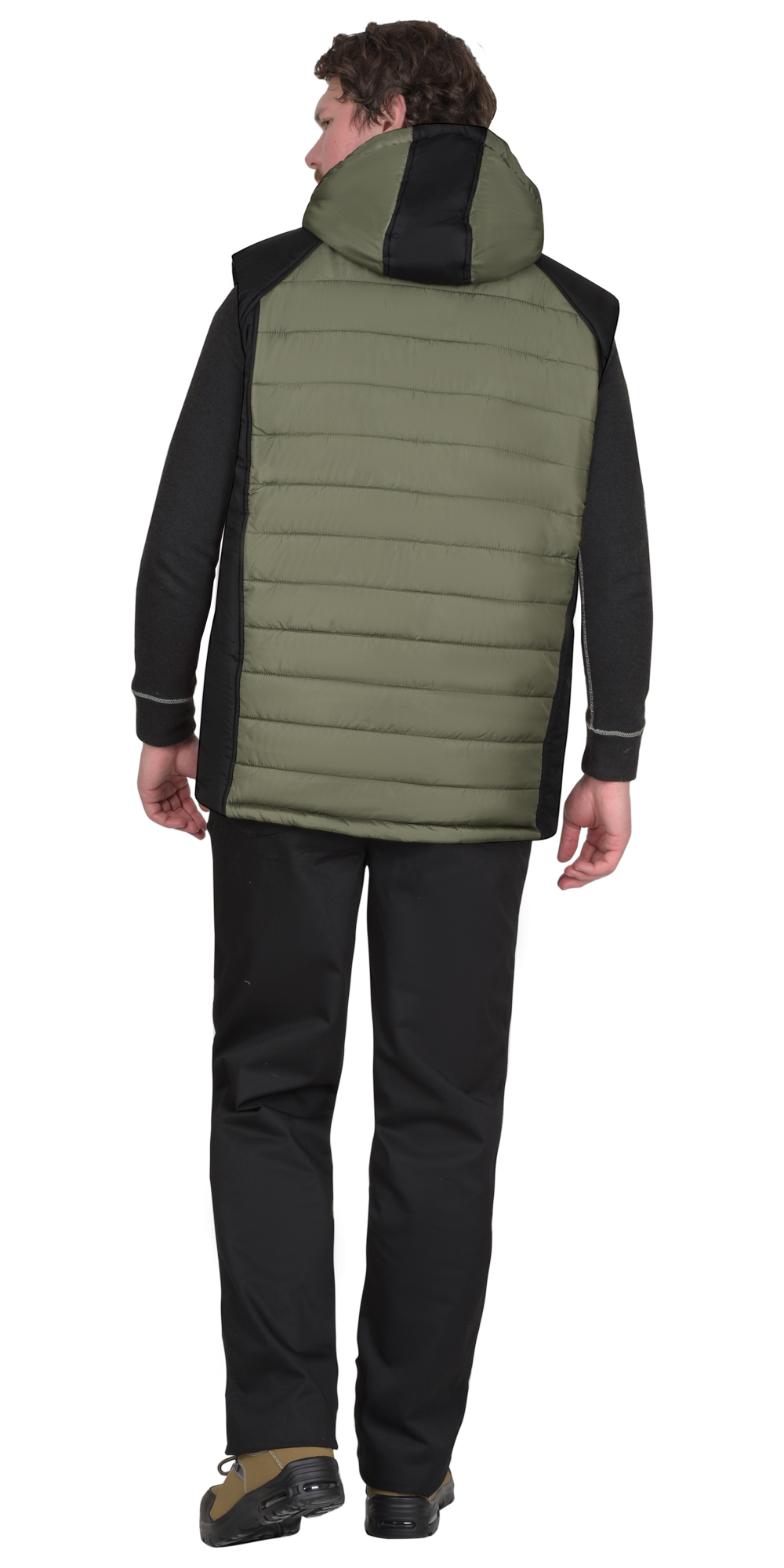Жилет комбинированный из ткани двух цветов, с центральной застежкой на молнию, с удлиненной фигурной линией низа по спинке, с втачным капюшоном. Центральные части переда и спинки простеганы вместе с утеплителем. Жилет с левым нагрудным прорезным карманом на молнию, нижние карманы в швах. На подкладке с правой стороны накладной карман на молнию.